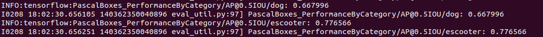 eval.py 파일도 은근 오랫동안 돌아요. 작업이 끝나면 아래와 같이 학습시킨 클래스에 대한(저는 dog, escooter 등)에 대한 정확도가 나옵니다.